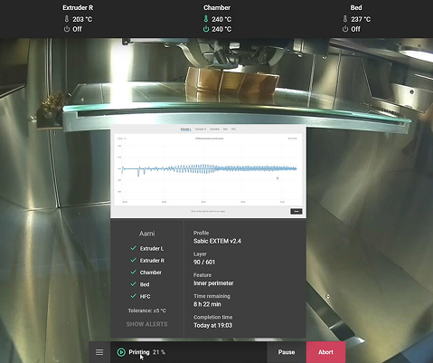 A câmara aquecida até 250 °C garante estabilidade térmica ao longo de todo o processo, reduzindo tensões internas e melhorando a qualidade mecânica das peças. A tecnologia servo de última geração permite aumentar significativamente a velocidade de impressão sem comprometer a qualidade, enquanto os sistemas de monitorização em tempo real asseguram controlo de processo e conformidade industrial.