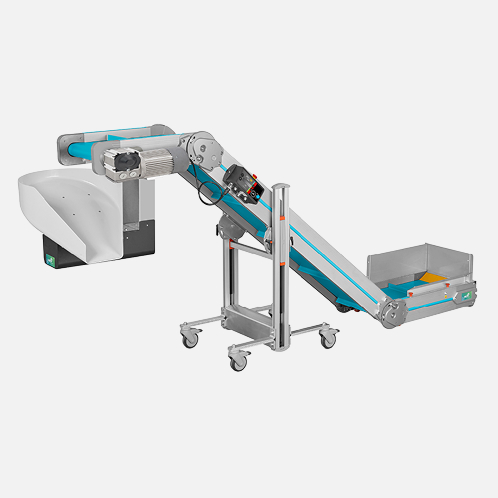 Elevadores com tremonha de carga e transportadores estreitos e compactos especificamente concebidos para serem integrados em linhas.